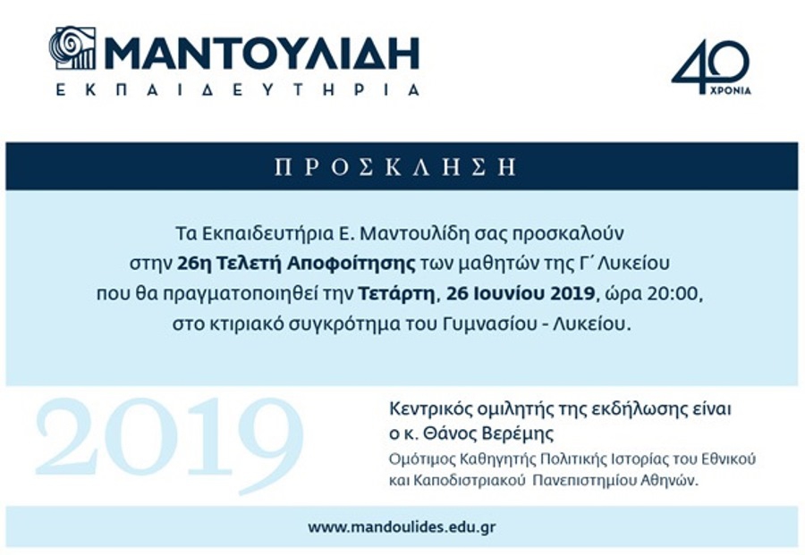 ΕΚΠΑΙΔΕΥΤΗΡΙΑ ΜΑΝΤΟΥΛΙΔΗ - 26η Τελετή Αποφοίτησης 2019