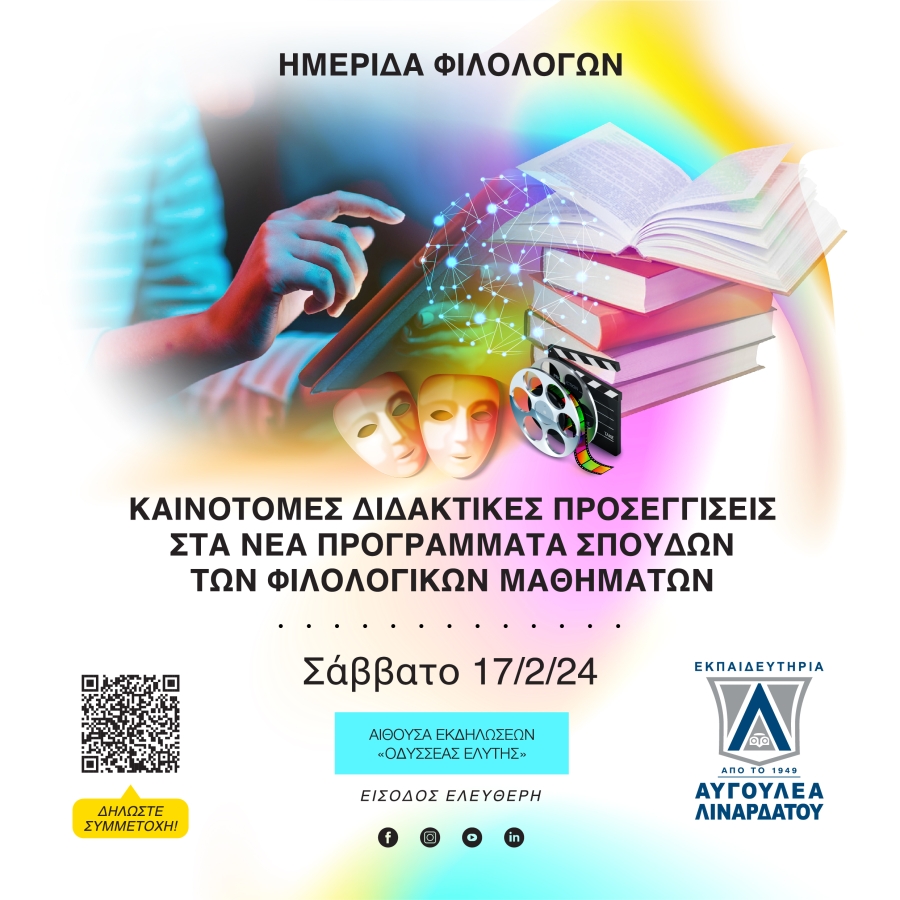 Τα Εκπαιδευτήρια Αυγουλέα-Λιναρδάτου, καλούν τα μέλη της εκπαιδευτικής κοινότητας να συμμετάσχουν στις εργασίες μιας ακόμα ημερίδας, την οποία διοργανώνει ο κλάδος φιλολόγων των Εκπαιδευτηρίων. Στόχος της ημερίδας είναι η ανάδειξη της αξιοποίησης των εργαλείων που παρέχει η Τεχνολογία στη διδακτική πράξη καθώς και η σύνδεση των φιλολογικών μαθημάτων  με μορφές τέχνης (θέατρο, κινηματογράφος), σύμφωνα με τα Νέα Προγράμματα Σπουδών. Η ημερίδα θα πραγματοποιηθεί το Σάββατο, 17 Φεβρουαρίου 2024, στις εγκαταστάσεις των Εκπαιδευτηρίων (Ελευθερίου Βενιζέλου 112-114), στο Περιστέρι.